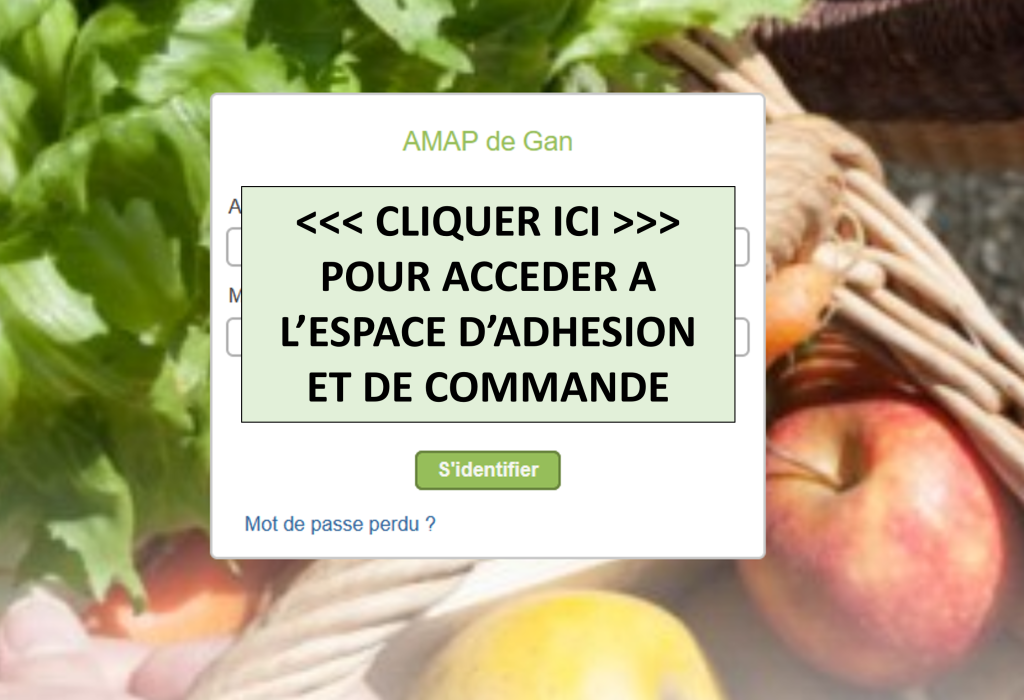 Si vous n’êtes pas (encore) amapien.ne et que vous souhaitez accéder à AmapJ pour avoir des informations sur les produits (prix, fréquences de distribution…), sans aucun engagement de votre part, envoyez un e-mail à amap.gan@gmail.com : vous recevrez sous peu un e-mail avec votre identifiant (votre adresse e-mail) et votre mot de passe (que nous vous invitons à changer dès votre première connexion) pour accéder à AmapJ